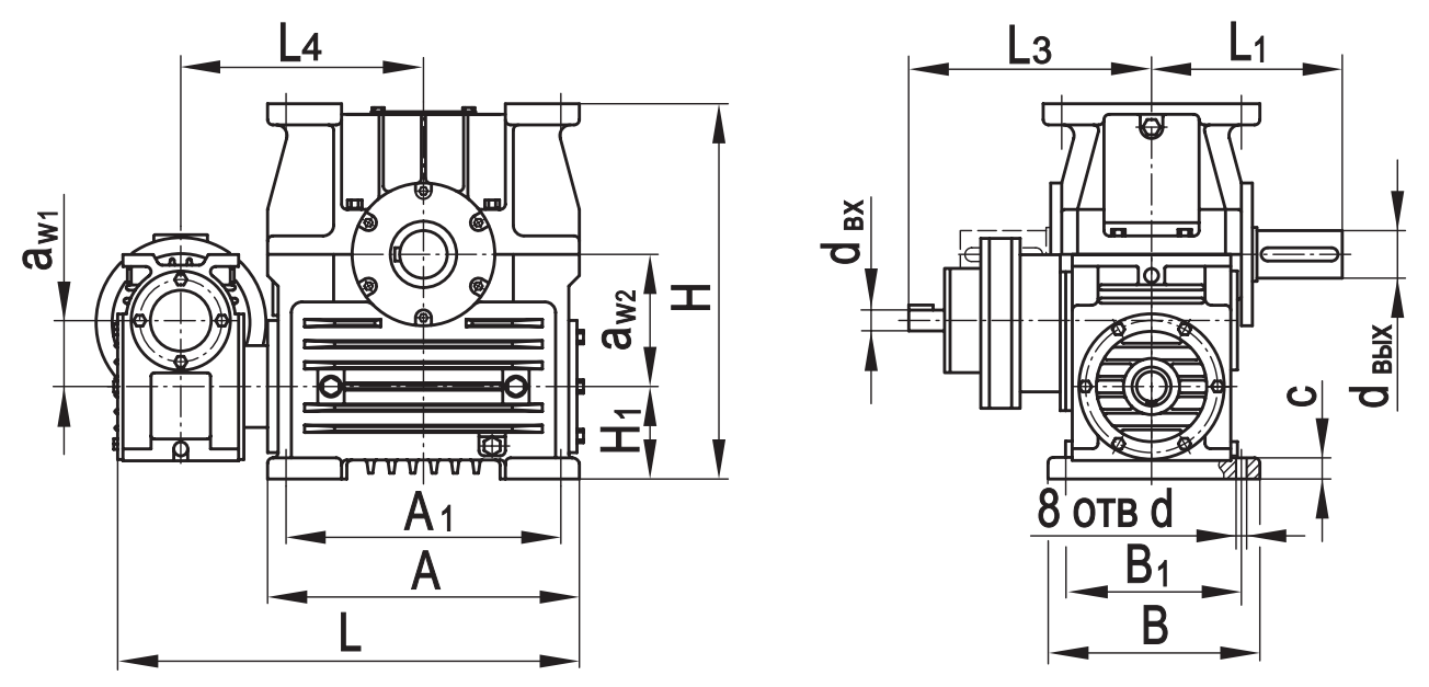 Типоразмер аW1 аW2 А А1 В В1 L* L1* L2max L3* L4 Н Н1 с d dвх dвых